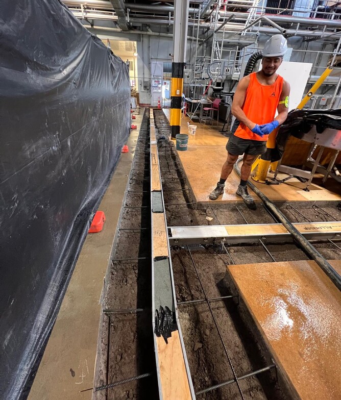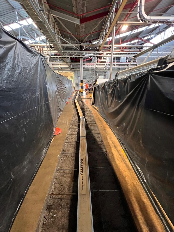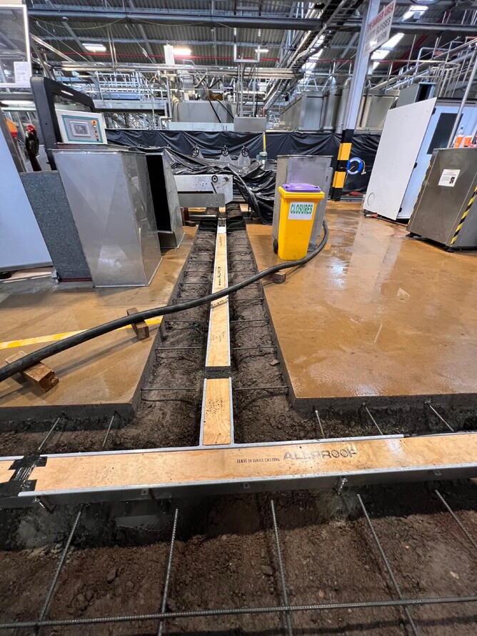 Working inside a live factory environment requires a different level of care. The Abbotts crew handled every stage of the job, from cutting and trenching through reinforced concrete, to installing and aligning the Allproof channel drain components, and finally concreting and finishing to a factory-grade standard.